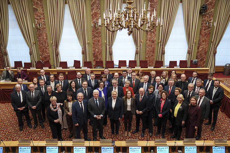 Luftaufnahme des Schweriner Schlosses, das von Wasser umgeben auf einer Insel im Schweriner See liegt. Umgeben von Bäumen, Brücken und angrenzenden historischen Gebäuden, erstreckt sich im Hintergrund die Stadt Schwerin.