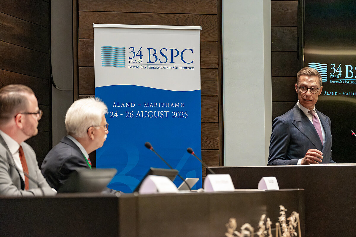 Zu Beginn der Konferenz hielt der Präsident der Republik Finnland, Alexander Stubb, die Eröffnungsrede und stellte den russischen Angriffskrieg gegen die Ukraine in den Mittelpunkt seiner Ausführungen. Präsident Stubb bezeichnete die Aggression als „Wendepunkt in der Weltgeschichte“ und betonte, dass es keine Rückkehr zur alten Ordnung geben könne. „Russland hat gegen die Grundprinzipien des Völkerrechts verstoßen, und das darf nicht ohne Folgen bleiben“, unterstrich er und begrüßte die beispiellose Einigkeit unter den Ostseeanrainerstaaten. Er forderte gemeinsame Anstrengungen zum Schutz kritischer Unterwasserinfrastrukturen vor hybriden Bedrohungen, darunter auch der sogenannten „Schattenflotte“ Russlands.