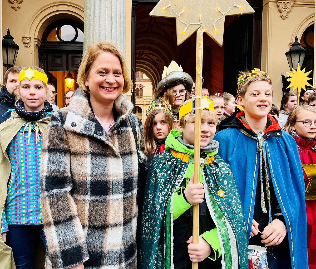 Landtagspräsidentin Birgit Hesse hat am heutigen Dreikönigstag Kinder aus katholischen Kirchgemeinden Stralsund, der Region Rostock, Wismar, Ludwigslust sowie der Montessori-Schule Schwerin am Sitz des Landesparlaments begrüßt. Die Sternsinger brachten den traditionellen Dreikönigssegen für das neue Jahr „20+C+M+B+23“ Christus Mansionem Benedicat = Christus segne dieses Haus) am Portal des Landtages und am Büro der Präsidentin an.