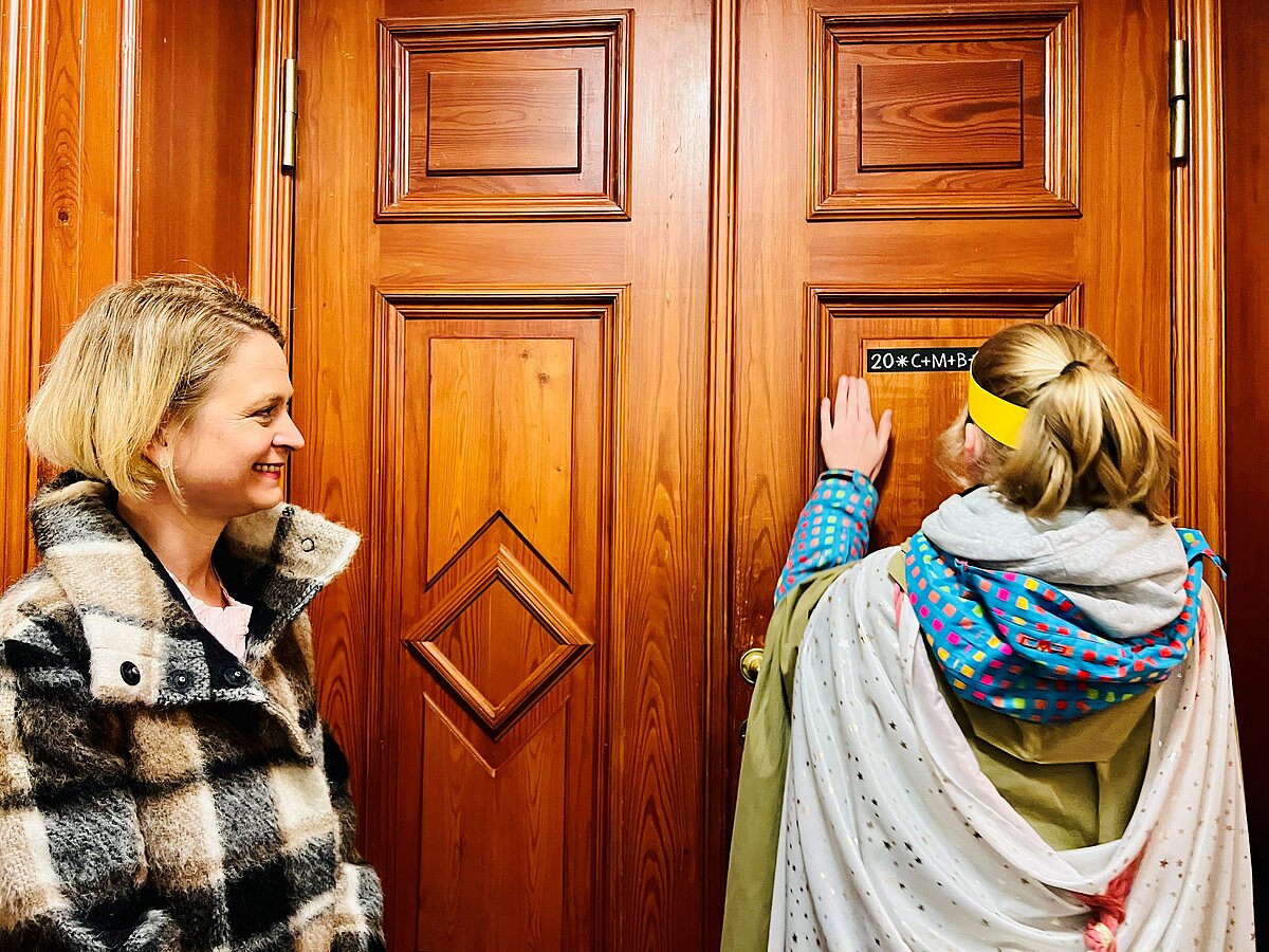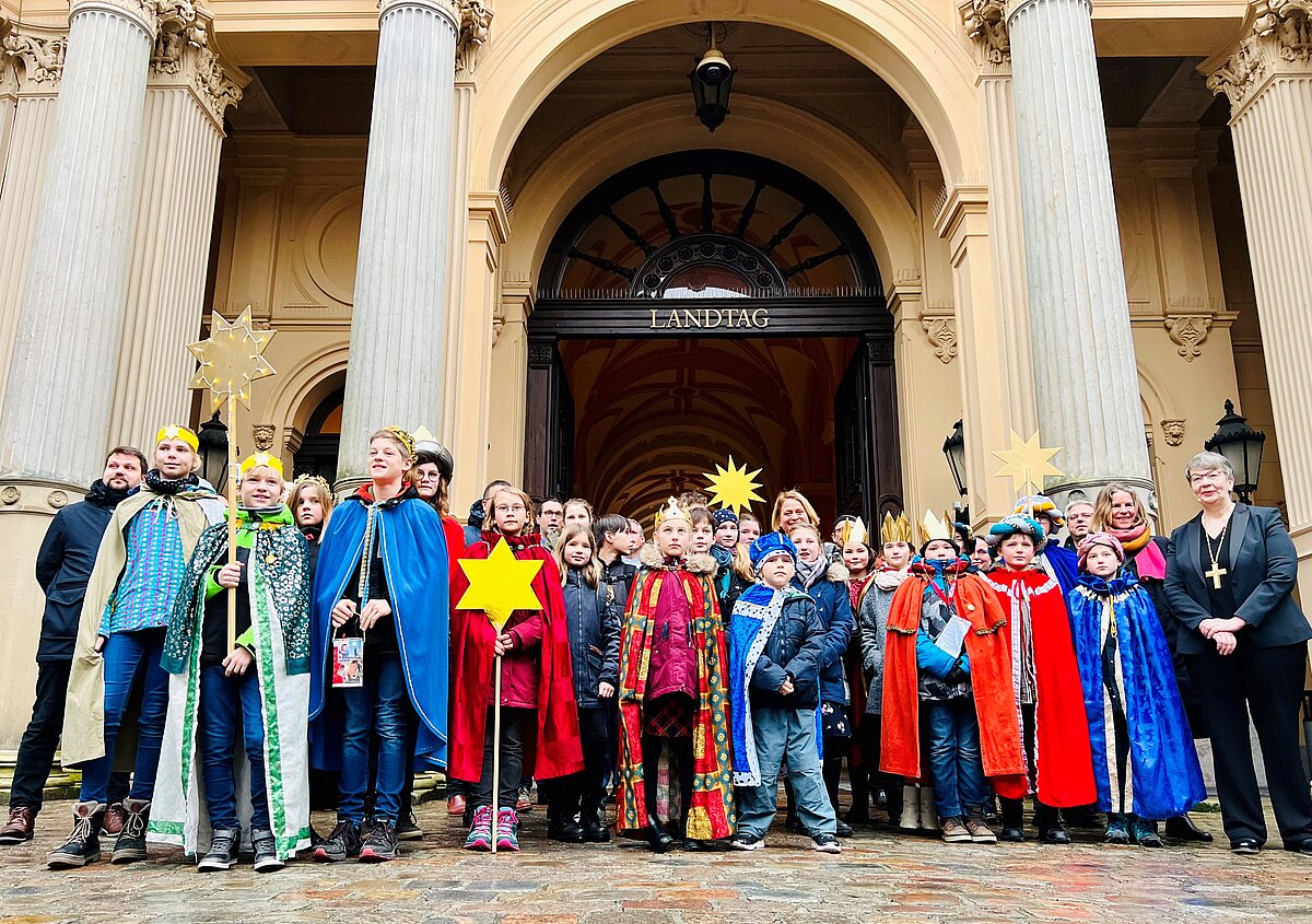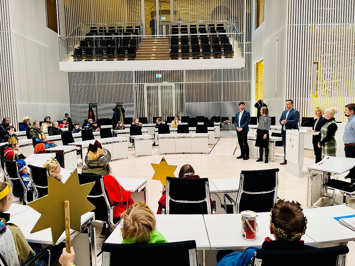 Nach einer Andacht in der Schlosskirche kamen die Gäste im Plenarsaal mit der Präsidentin und weiteren Abgeordneten ins Gespräch. „Ich freue mich sehr über euren Besuch, denn ihr macht auf ein wichtiges Anliegen aufmerksam - den Kinderschutz. Ihr beweist Mitgefühl und zeigt uns Erwachsenen mit eurem Einsatz zugleich, was möglich ist, wenn Einzelne sich an vielen Orten dafür einsetzen, unsere Welt ein wenig besser zu machen“, wandte sich Landtagspräsidentin Birgit Hesse an die Mädchen und Jungen. Sie dankte den Kindern und all denjenigen, die die Sternsinger-Aktion im Land tragen im Namen des Landtages für deren Engagement.