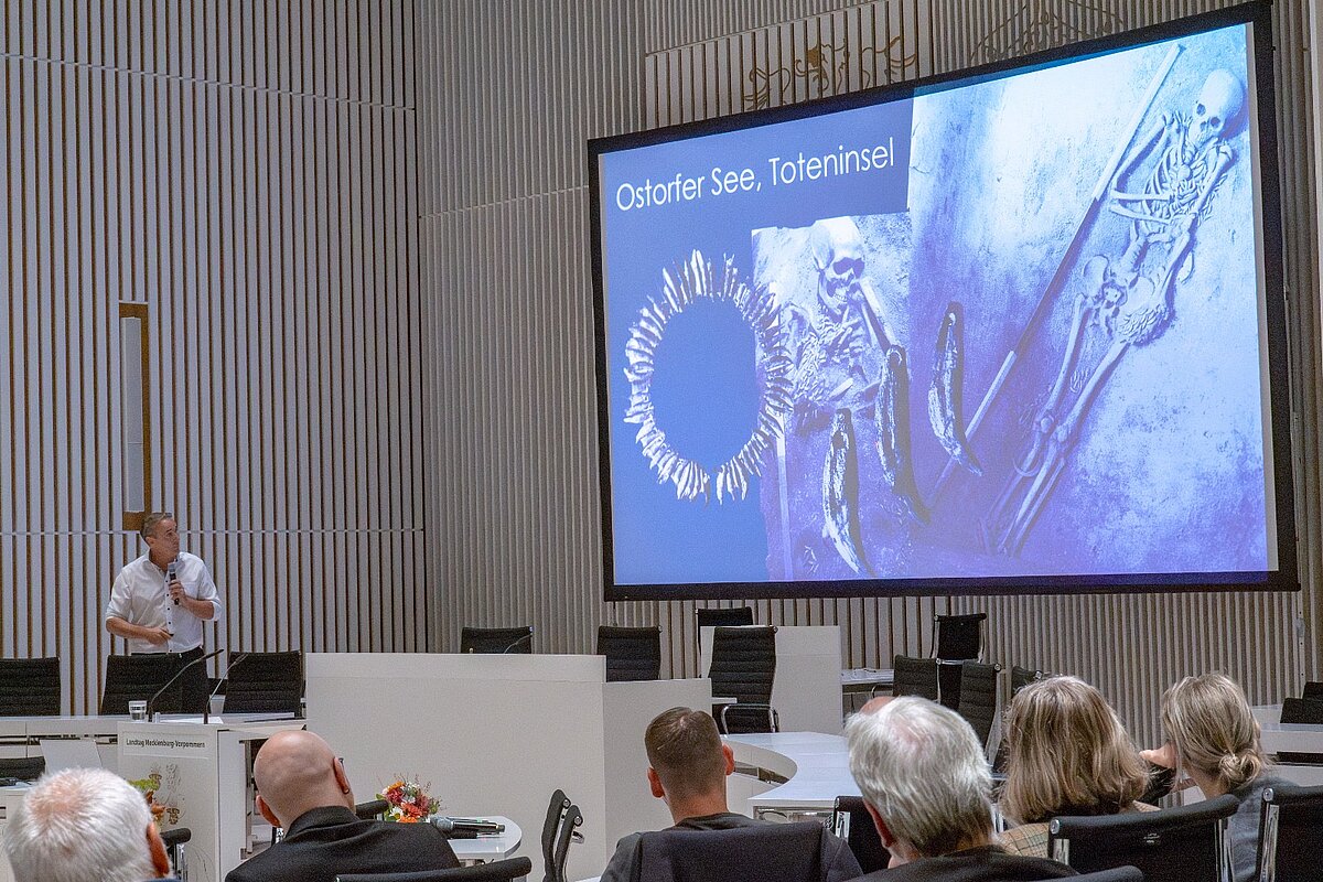 Nach der Begrüßung durch Landtagspräsidentin Birgit Hesse und einem Grußwort von Roland Methling, Vorsitzender des Freundeskreises Archäologisches Landesmuseum e.V., berichtete der ehrenamtliche Bodendenkmalpfleger Carsten Schmoldt von herausragenden Funden und Fundgeschichten der vergangenen Jahre.