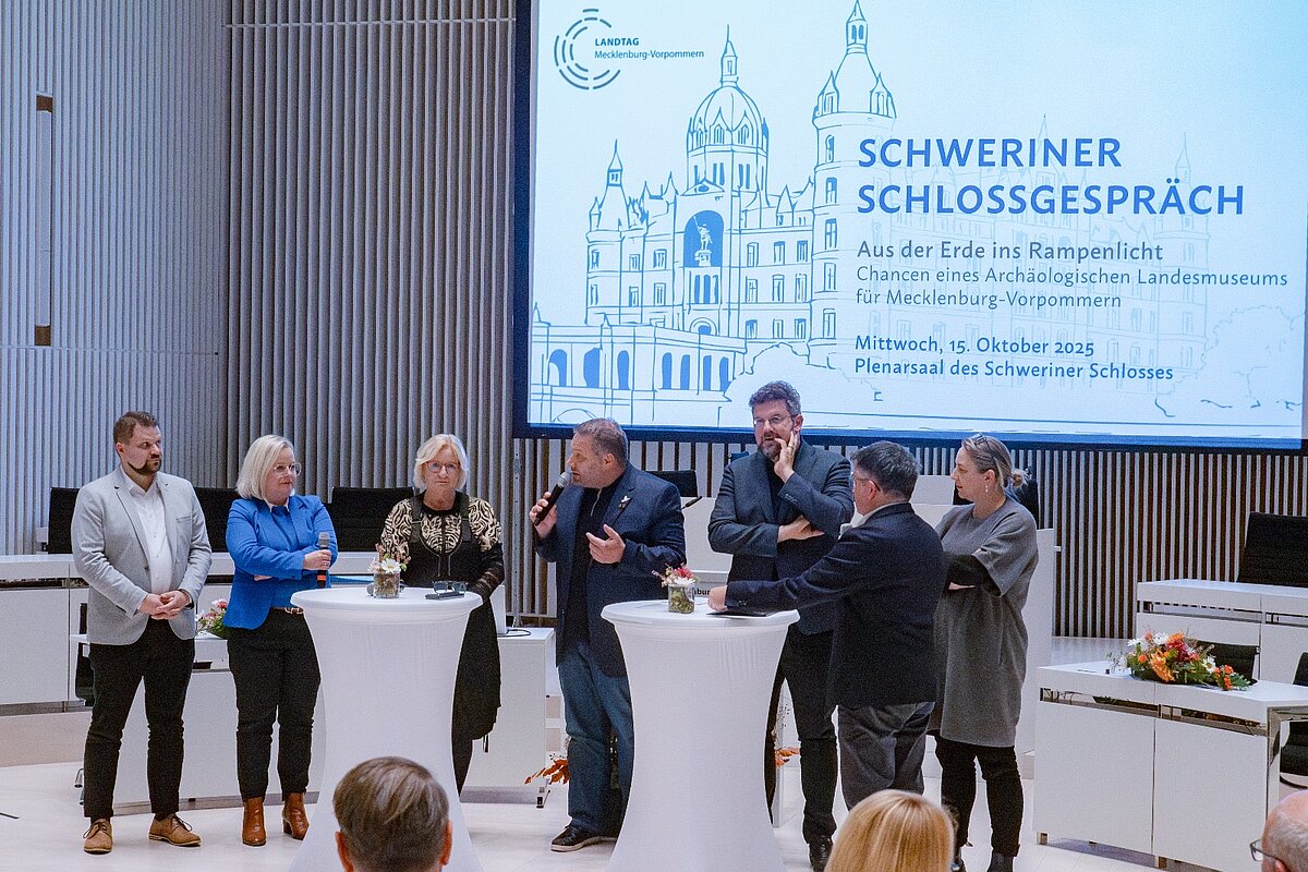 Am 15. Oktober 2025 fand im Plenarsaal des Schweriner Schlosses ein weiteres Schlossgespräch statt. Unter dem Titel „Aus der Erde ins Rampenlicht – Chancen eines Archäologischen Landesmuseums für Mecklenburg-Vorpommern“ stand die Bedeutung archäologischer Funde für Forschung, Bildung und regionale Identität im Mittelpunkt.