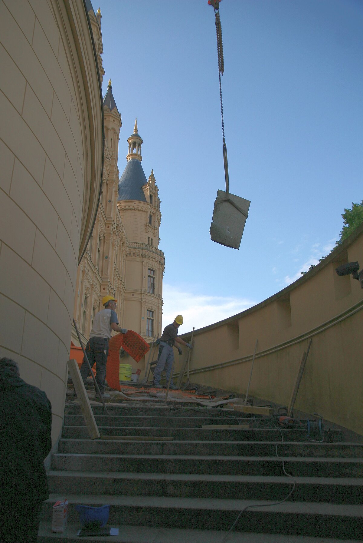 Ein mobiler Kran hat heute (13. August 2014) von der Lennéstraße aus schweres Baumaterial zum Abtransport vor das Schweriner Schloss gehoben. Hintergrund: Im Vorhof des Schlosses wird altersbedingt eine Treppe erneuert. Die Arbeiten stehen nicht im Zusammenhang mit dem Einbau eines neuen Plenarsaals in den ehemaligen Festsaal. Bei der Außentreppe in der Nähe des Burgseeflügels handelt es sich um eine von zwei Zuwegungen, die vom Vorhof hinauf auf die Kollonnaden führen. Der Betrieb für Bau und Liegenschaften Mecklenburg-Vorpommern zeichnet für die Arbeiten verantwortlich.