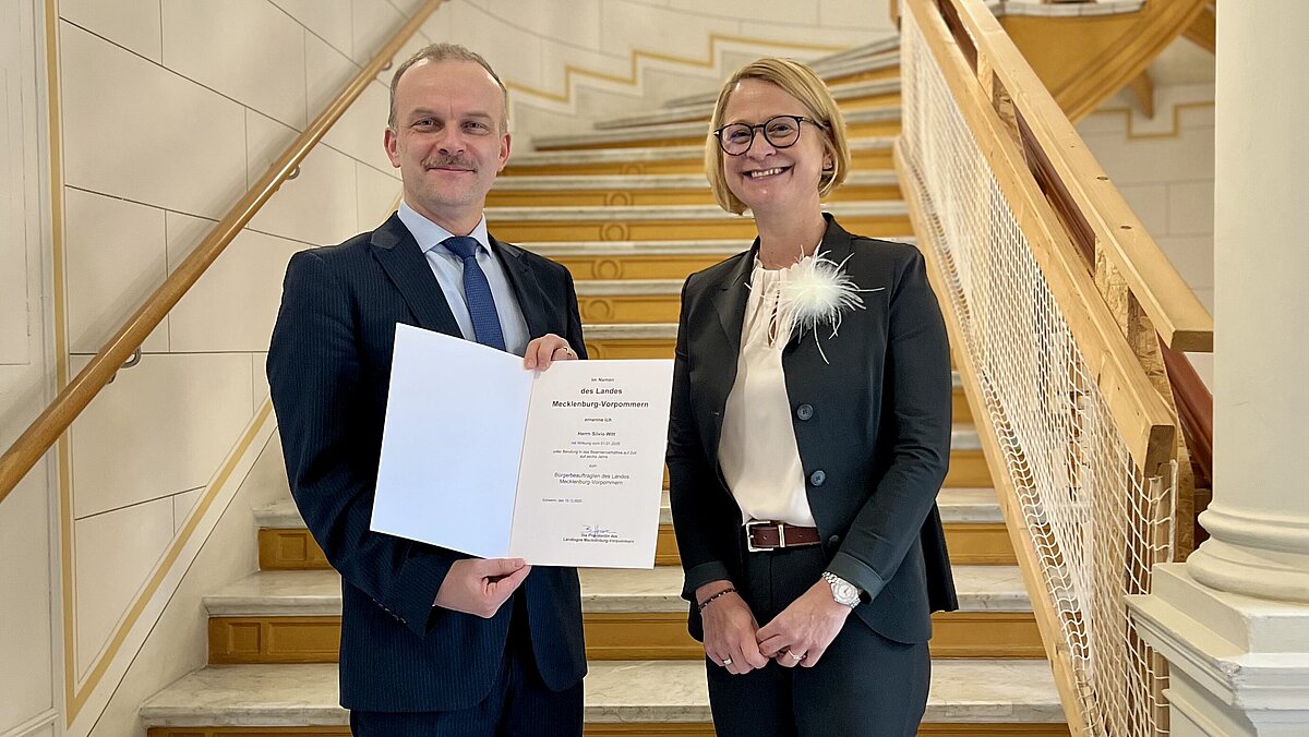 Am Mittwoch (10. Dezember 2025) ist Silvio Witt offiziell zum Bürgerbeauftragten des Landes Mecklenburg-Vorpommern ernannt worden. Am Rande der Plenarsitzung überreichte Landtagspräsidentin Birgit Hesse die Ernennungsurkunde an Silvio Witt, der sein Amt zum 1. Januar 2026 antreten wird.