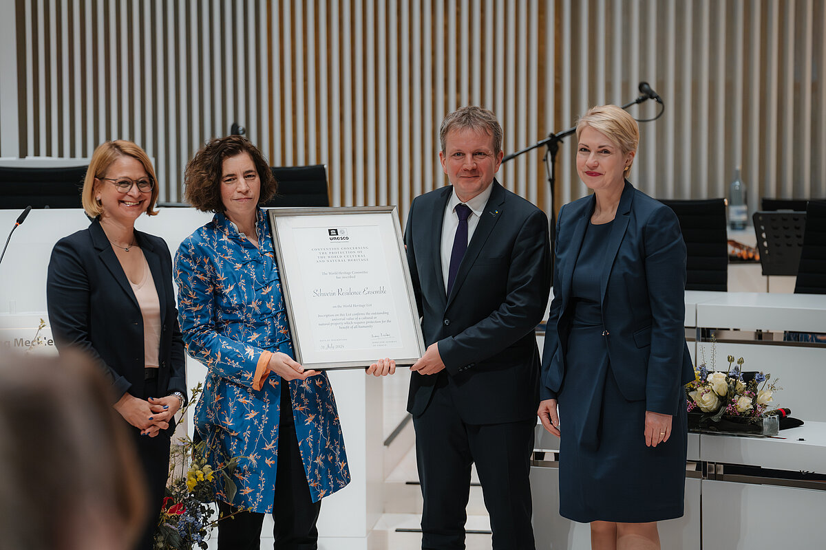 Am Montag, den 7. April 2025, wurde im Plenarsaal des Schweriner Schlosses die offizielle UNESCO-Welterbe-Urkunde für das Residenzensemble Schwerin feierlich übergeben.