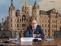 Leerer Plenarsaal des Landtags Mecklenburg-Vorpommern mit modernen, halbrund angeordneten Tischen und schwarzen Drehstühlen vor einer hellen Lamellenwand mit hohen Fenstern Am 26. Oktober 2021 trat der neu gewählte Landtag Mecklenburg-Vorpommern zu seiner konstituierenden Sitzung im Plenarsaal des Schweriner Schlosses zusammen. Die Sitzung begann um 14:02 Uhr und endete…